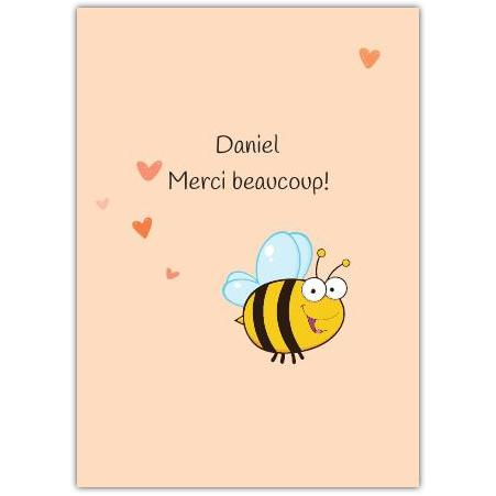 Say thank you with a smile! This charming greeting card features an adorable, cheerful bee surrounded by floating hearts, perfectly conveying warmth and gratitude. The soft peach background adds a gentle, friendly touch, making it ideal for expressing your heartfelt thanks in a sweet and personal way.