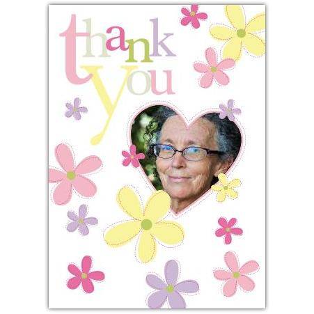 Brighten someone's day with this charming "Thank You" greeting card, beautifully designed with cheerful pastel flowers and a heart-shaped frame on the cover—perfect for adding a personal touch with a photo.