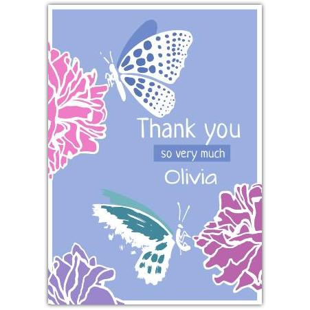Express heartfelt gratitude with this charming personalised 'Thank You So Very Much' card, featuring two delicate butterflies and vibrant floral accents on a soothing lavender background.