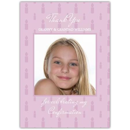 Express your heartfelt gratitude with this beautifully designed personalised Confirmation thank you card. Featuring a soft pink background adorned with delicate candle motifs, this card is perfect for thanking loved ones who shared in your special Confirmation day. At the centre, a cherished photo of the recipient can be added, making this card a truly unique keepsake.