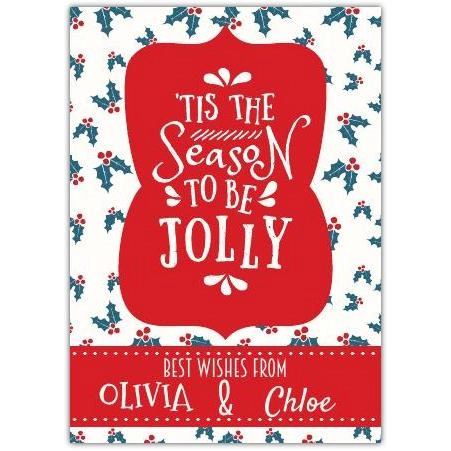 Celebrate the joy of the festive season with this charming personalised Christmas card, featuring the classic phrase 'Tis the Season to Be Jolly in a beautifully styled font. Set against a delicate holly and berry patterned background, this card perfectly captures the warmth and cheer of Christmas.