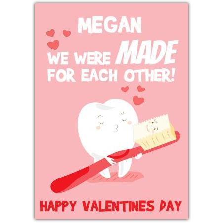 Add a touch of fun and charm to your Valentine’s Day with this delightful card featuring a cute tooth character holding a toothbrush, accompanied by the personalised message: "[Name], we were made for each other!" This sweet and quirky design is perfect for sharing a smile and expressing your affection in a unique way.