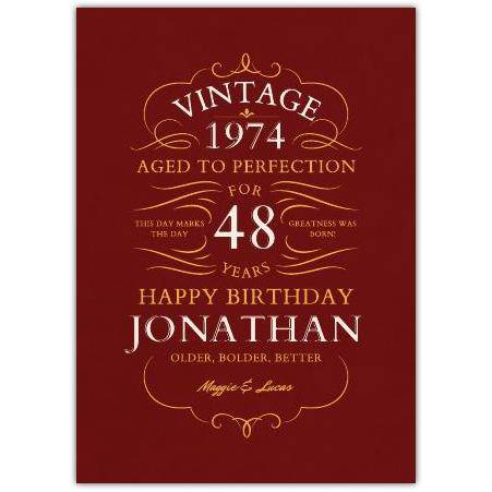 This stylish and elegant greeting card is perfect for marking the special milestone of turning 48. Featuring a classic vintage design with warm, rich tones and tasteful typography, it reads "Vintage 1974 – Aged to Perfection for 48 Years," making it a charming tribute to the birthday celebrant's journey through life.