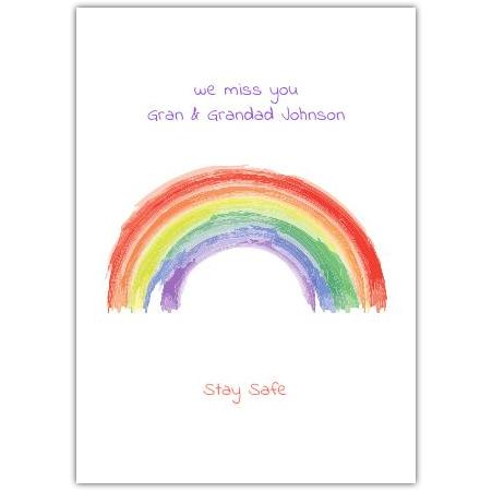 Express your heartfelt feelings with this charming We Miss You Stay Safe greeting card, featuring a beautifully painted rainbow in soft, vibrant colours that brighten the day. The gentle, hand-painted design perfectly conveys warmth and care, making it an ideal way to let loved ones know you’re thinking of them, especially when distance keeps you apart.
