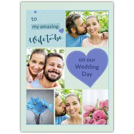 Celebrate your special moment with this heartfelt Wedding Day Wife To Be Photo Greeting Card. Featuring a charming collage design in soothing green and purple tones, this card beautifully combines personal photos with thoughtful floral accents and a sweet message that reads: "to my amazing Wife-to-be on our Wedding Day."