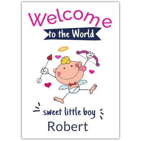 Celebrate the arrival of a precious little one with this charming Welcome to the World greeting card, specially designed for a sweet baby boy. Featuring a playful cupid baby illustration holding a bow and arrow, surrounded by hearts and joyful colours, this card is full of warmth and happiness.