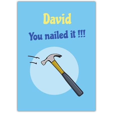 This cheerful and uplifting card features a playful illustration of a hammer in action, set against a bright blue background. With the fun message "You nailed it !!!", it's the perfect way to congratulate someone on a fantastic achievement.