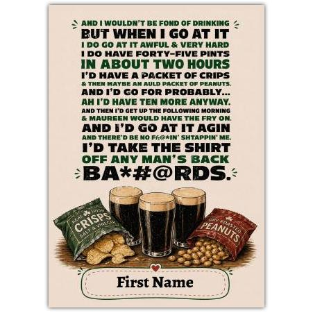 Celebrate the lively spirit of the true pint man with this cheeky and personalised greeting card! Featuring a humorous and relatable monologue about enjoying a good pint (or forty-five), this card is sure to bring a smile to anyone who appreciates a great drink and good craic.
