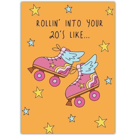 Make that special someone's 20th birthday truly memorable with this vibrant and playful greeting card. Featuring retro-style pink roller skates with wings, surrounded by cheerful yellow and blue stars against a bright orange background, this card perfectly captures the excitement and energy of stepping into your twenties.