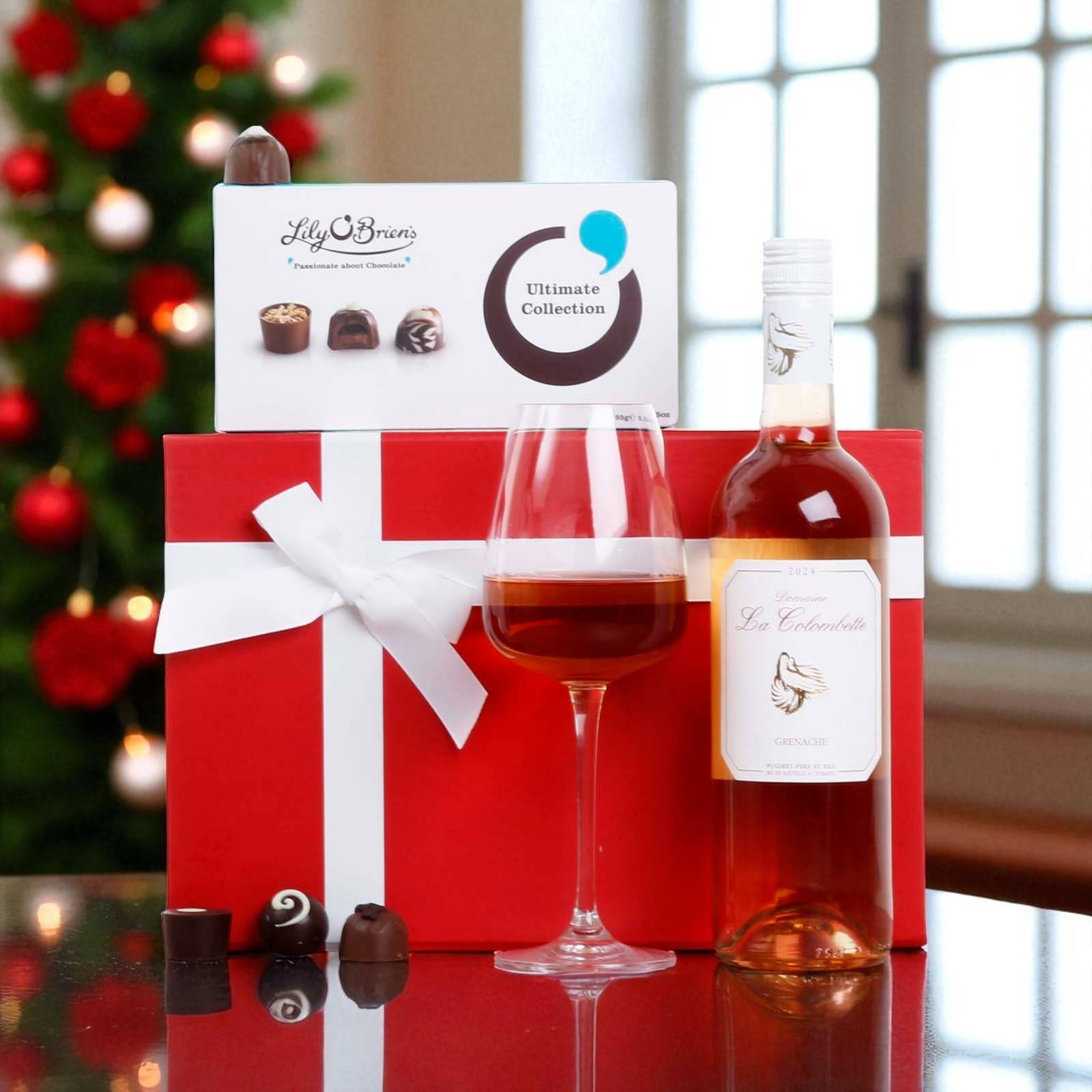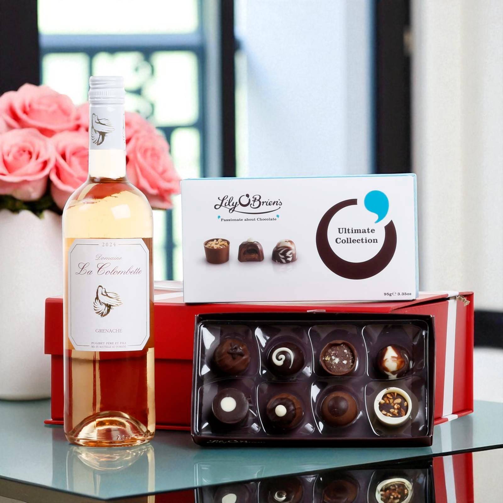 A box of luxury chocolates from the Irish producer Lily O'Brien's, coupled with a bottle of New Zealand Rosé.