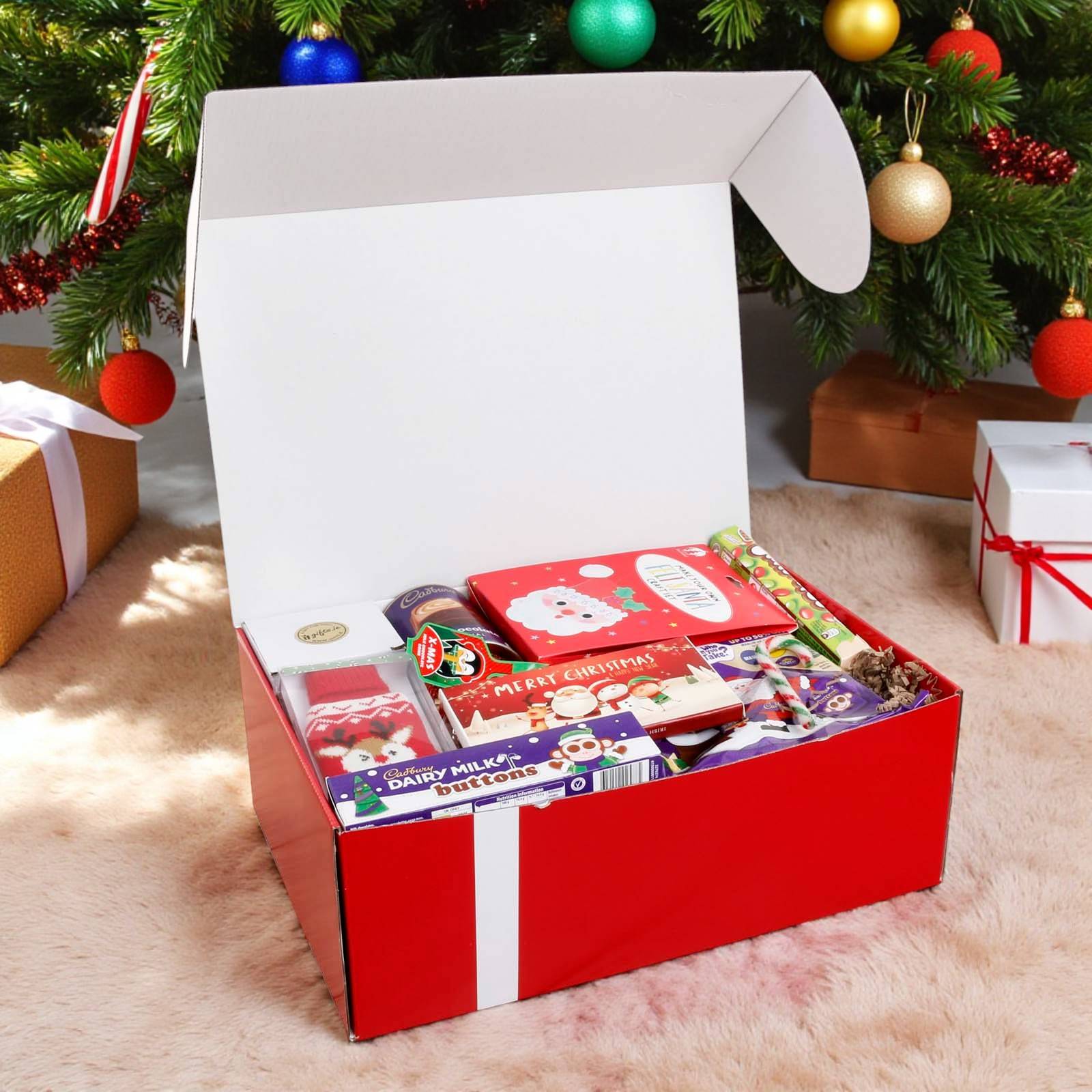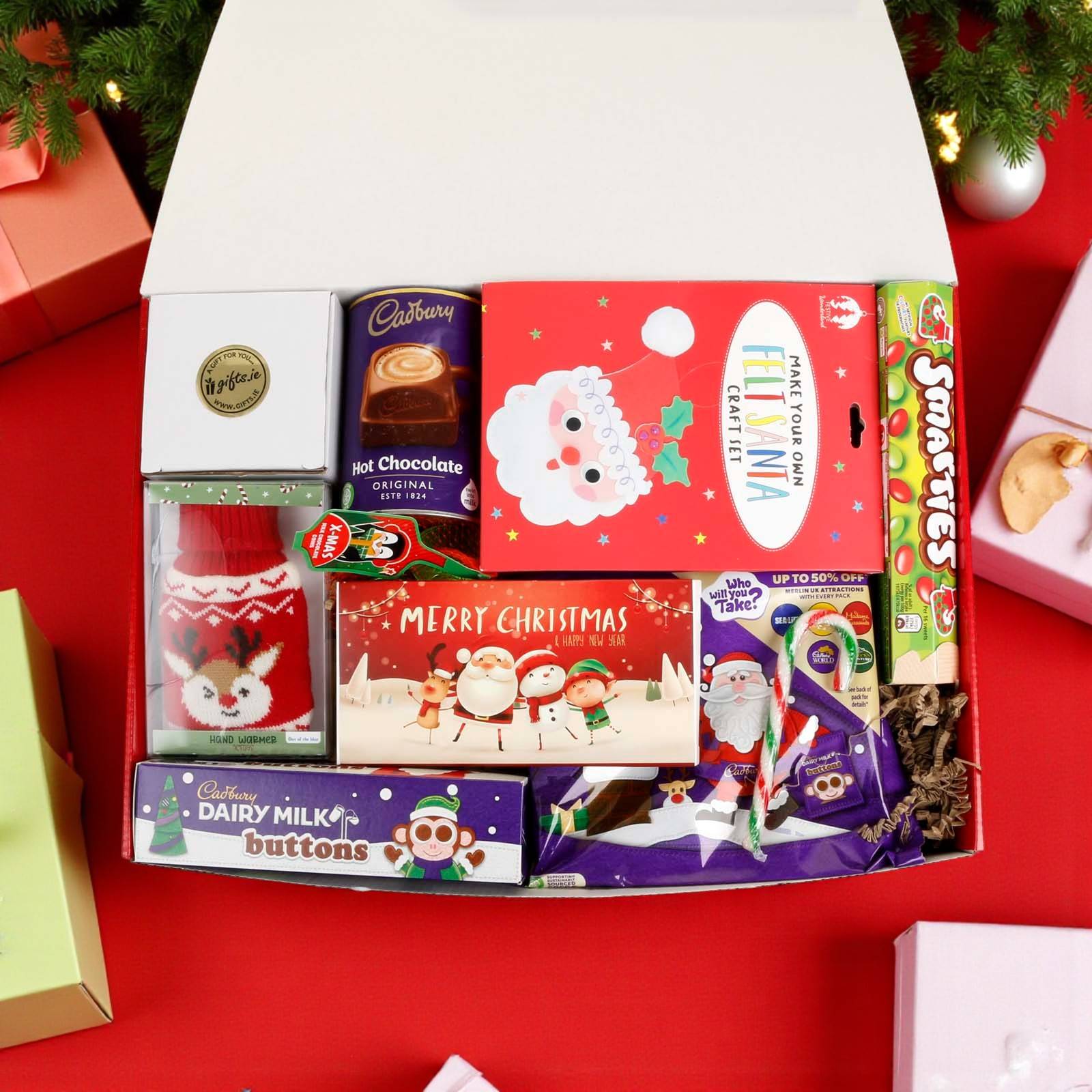 • Delicious seasonal treats: Includes an indulgent selection of Cadbury chocolates, Haribo Chamallows, Christmas chocolate buttons, candy cane, and more, perfect for cosy winter snacking.