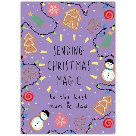 Celebrate the festive season with this charming Christmas card, specially designed to send warm wishes to the most important people in your life—your mum and dad. Featuring a delightful purple background adorned with festive icons such as snowmen, gingerbread houses, candy canes, and twinkling fairy lights, this card perfectly captures the joyful spirit of Christmas.