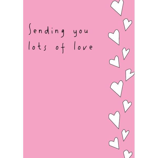 Express your heartfelt feelings with this charming Sending Love greeting card, perfect for Valentine's Day or any occasion when you want to share some extra love. Featuring a playful pink background with a cascade of white hearts and a warm handwritten message, "Sending you lots of love," this card is sure to bring a smile to your special someone's face.