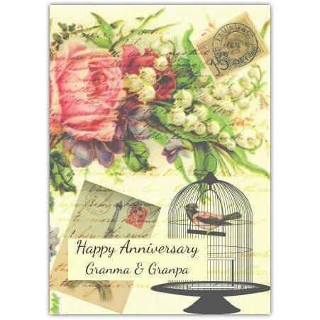 Celebrate a special anniversary with this beautifully vintage-inspired greeting card, featuring a charming shabby chic design. With delicate roses, soft greenery, and a sweet bird perched inside an ornate birdcage, this card exudes nostalgic romance and timeless elegance.