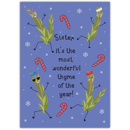 Featuring charming, dancing sprigs of thyme wearing colourful crowns and sunglasses, surrounded by candy canes and snowflakes, this card brings a touch of humour and warmth to your holiday greetings. The pun “Sister, it’s the most wonderful thyme of the year!” is sure to bring a smile and brighten her festive spirit.