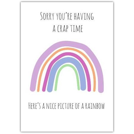 Let someone know you're thinking of them during a tough time with this charming and lighthearted greeting card. Featuring a sweet, pastel-coloured rainbow and the cheeky message, "Sorry you're having a crap time. Here's a nice picture of a rainbow," it’s the perfect way to lift spirits and bring a smile when words alone aren't enough.