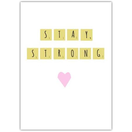 This uplifting greeting card features a charming scrabble-inspired design spelling out “Stay Strong”, accompanied by a soft pink heart. It’s a thoughtful way to send a message of encouragement and support to someone going through a tough time.