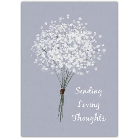 Express your heartfelt condolences with this elegant Sympathy White Flowers Card, featuring a delicate bouquet of white flowers set against a serene grey background. The soft, gentle design paired with the thoughtful message, "Sending Loving Thoughts," offers comfort and support during difficult times.