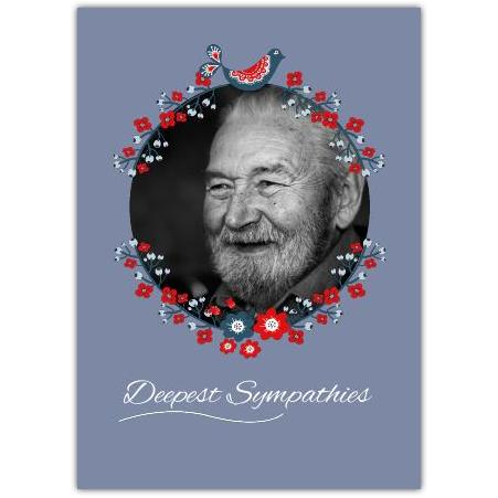 Express your heartfelt condolences with this beautifully designed sympathy card, featuring a gentle grey background adorned with a delicate floral frame and a charming bird motif. The subtle use of red and grey flowers around a circular photo space adds a touch of warmth and comfort, making it a thoughtful way to show you care during difficult times.