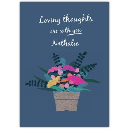 Sympathy Flowerpot With Flowers Card offers a heartfelt way to express your condolences and support during difficult times. Featuring a charming illustration of a flowerpot filled with vibrant blooms against a calming blue background, this card conveys warmth and comfort with the thoughtful message, "Loving thoughts are with you."