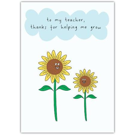 Express your gratitude with this charming greeting card, perfectly designed to thank a special teacher. Featuring two cheerful sunflowers and the sweet message, "to my teacher, thanks for helping me grow", this card beautifully symbolises growth, care, and encouragement.