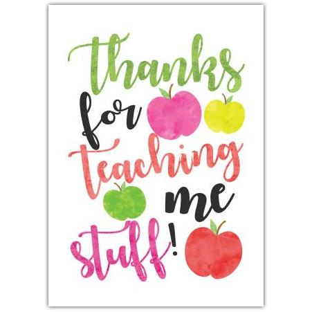 This delightful card features a playful handwritten-style message, "Thanks for teaching me stuff!" surrounded by vibrant, watercolour apple illustrations in various shades of red, green and yellow. It's a perfect way to express your appreciation to teachers and educators for their hard work, dedication, and the knowledge they’ve shared.