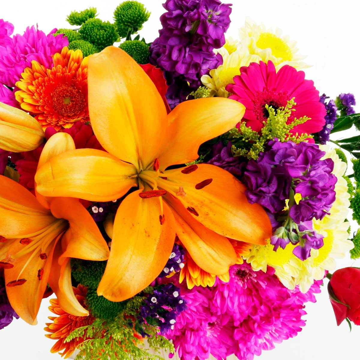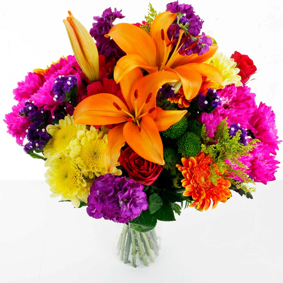 Beautiful and bountiful and amazingly colourful. This cheerful and bright arrangement will light up a room as well as a heart!