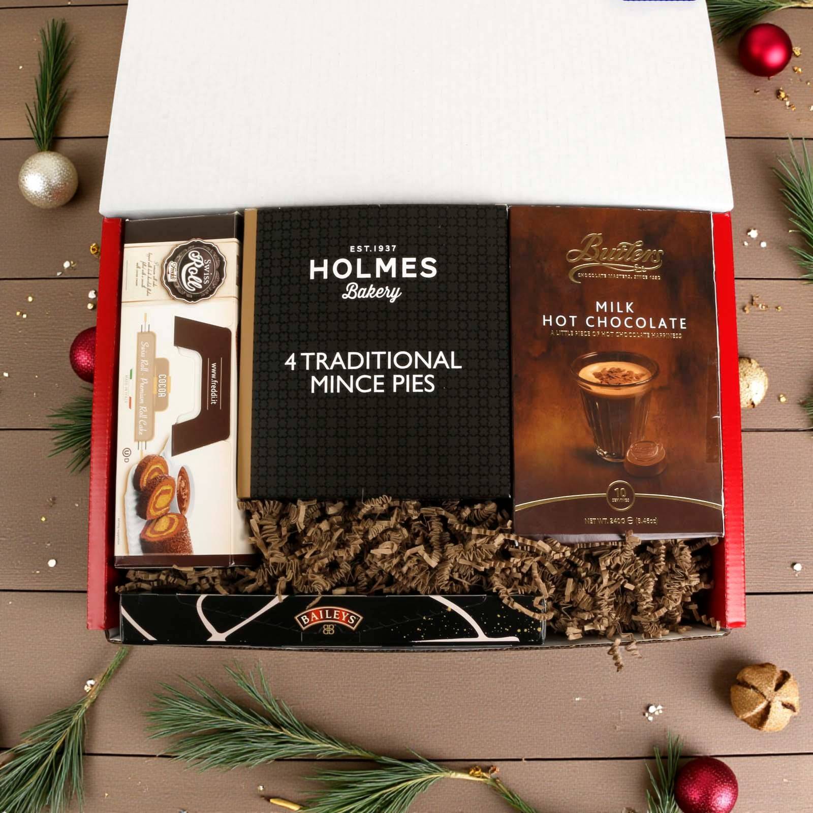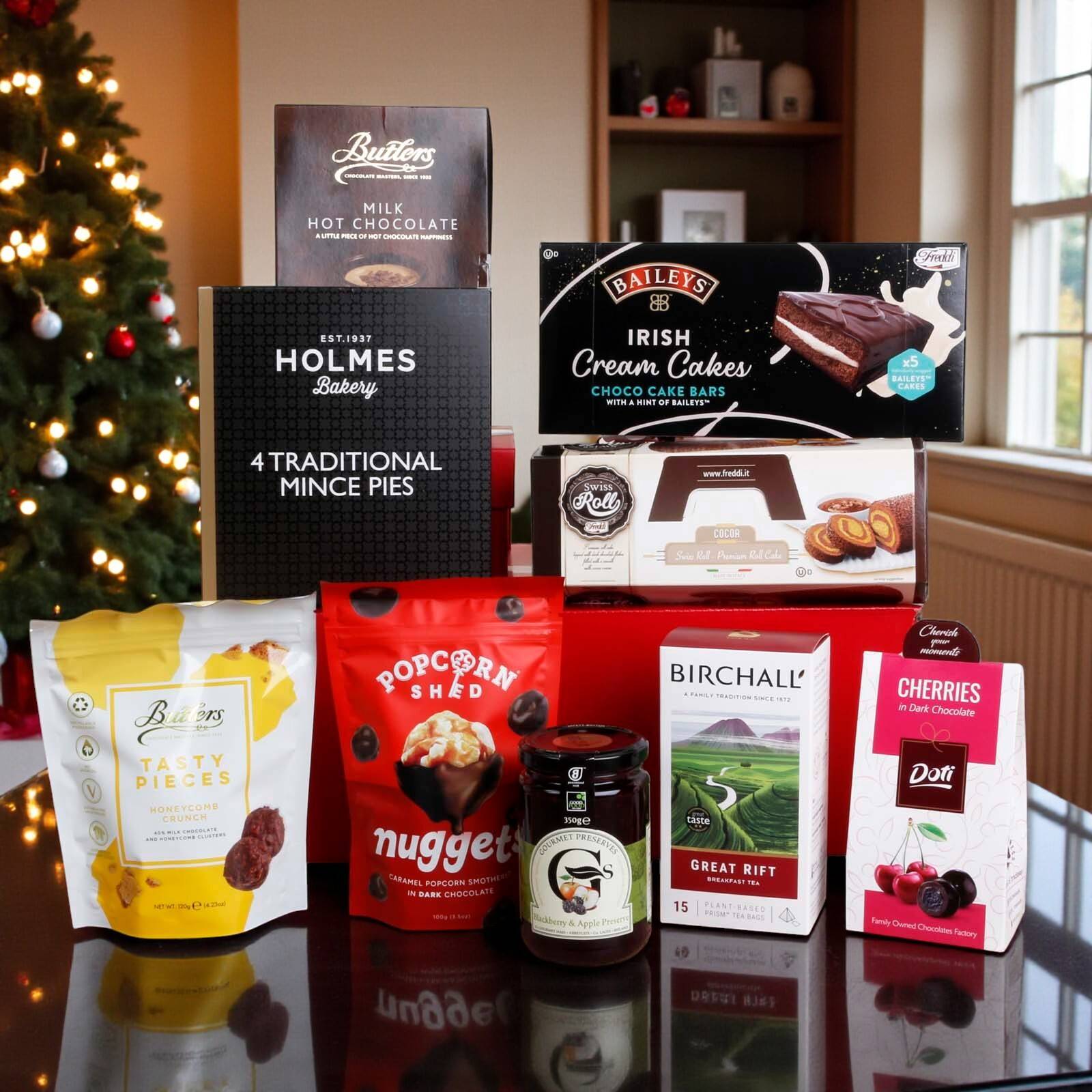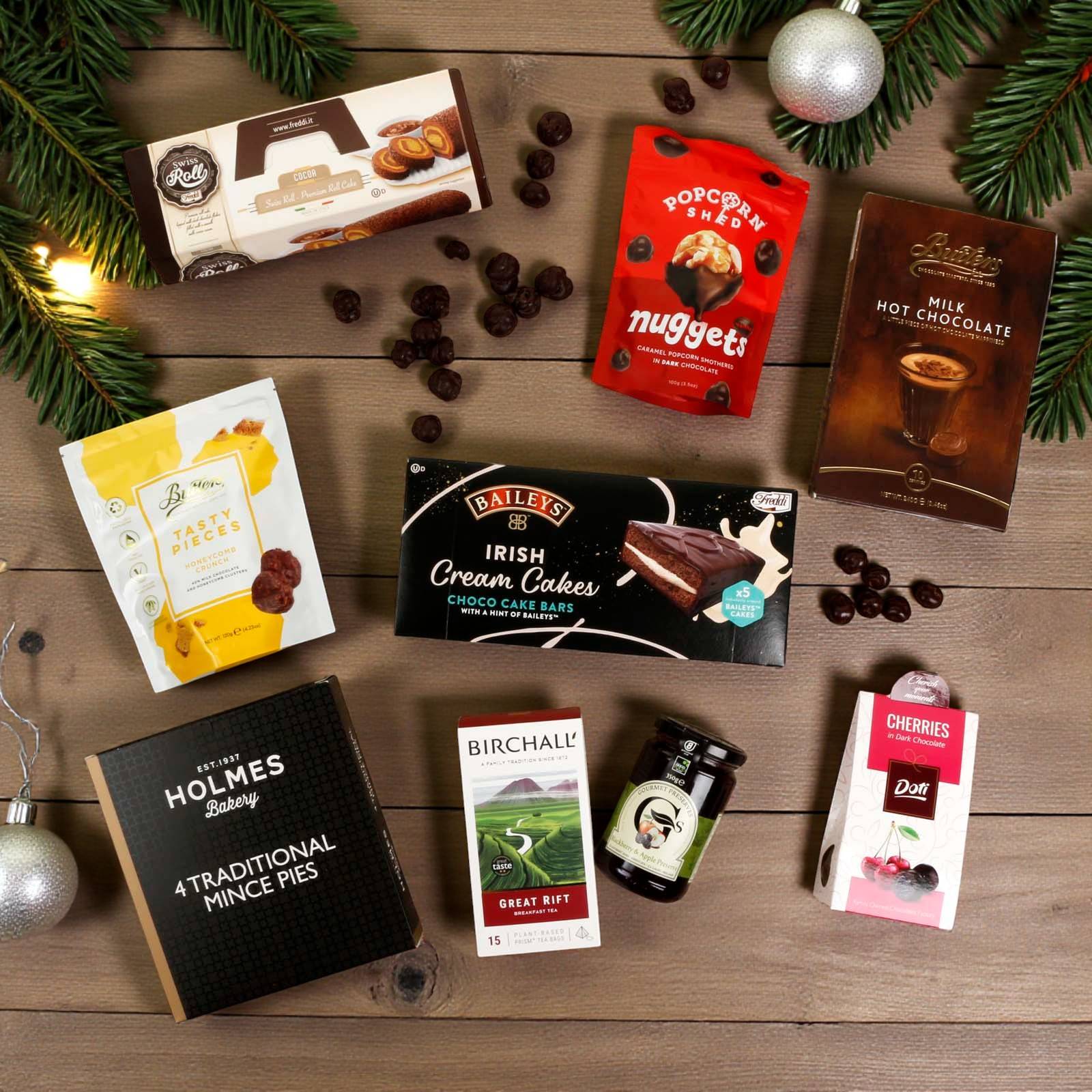 This charming hamper includes buttery mince pies, Swiss roll cake, Baileys chocolate bars, Butlers honeycomb chocolates, Caramel Popcorn, Doti chocolate cherries, blackberry jam, and a comforting selection of breakfast tea and hot chocolate.