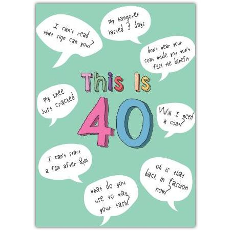 This cheerful and witty birthday card is perfect for anyone reaching the milestone age of 40. Featuring colourful, playful lettering surrounded by humorous speech bubbles with light-hearted jokes about turning 40, it’s sure to bring laughter and joy to the birthday celebration.