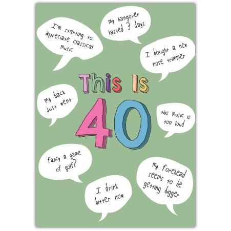 Celebrate 40 with a smile! This humorous 40th birthday card is perfect for marking this milestone with a light-hearted touch. Featuring playful speech bubbles with witty comments about turning 40, it brings a fun and relatable vibe to any birthday celebration.