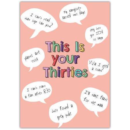 This cheerful birthday card is perfect for anyone stepping into their thirties with a smile. Featuring playful, colourful lettering surrounded by witty speech bubbles that capture the fun and quirks of adulting in your thirties, this card is sure to bring laughter and joy.