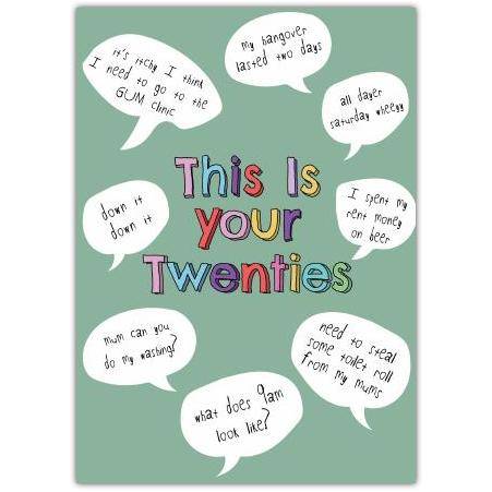 This Is Your Twenties Humorous Green Birthday Card with Speech Bubbles