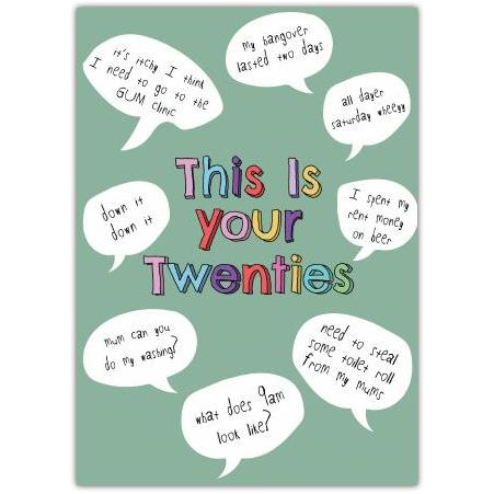 This Is Your Twenties Green Birthday Card is a playful and relatable way to celebrate a special birthday milestone. Featuring colourful, hand-drawn lettering and humorous speech bubbles that capture the fun, chaotic essence of your twenties, this card is perfect for anyone navigating this unforgettable decade.