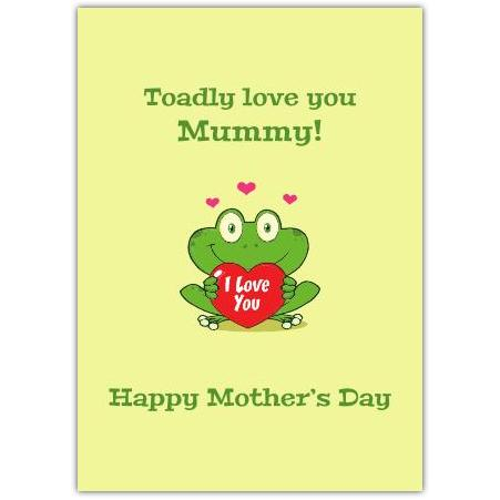 This charming Mother’s Day Toad Punny Greeting Card features an adorable cartoon toad holding a bright red heart that says "I Love You". With the playful pun "Toadly love you Mummy!" and cheerful yellow background, this card is sure to bring a smile to your mum’s face.