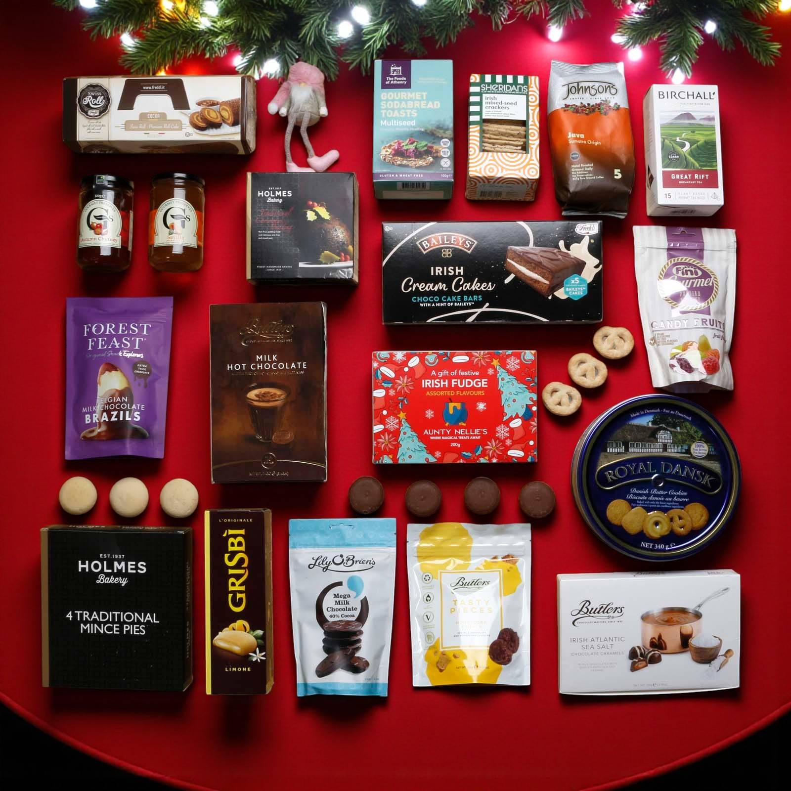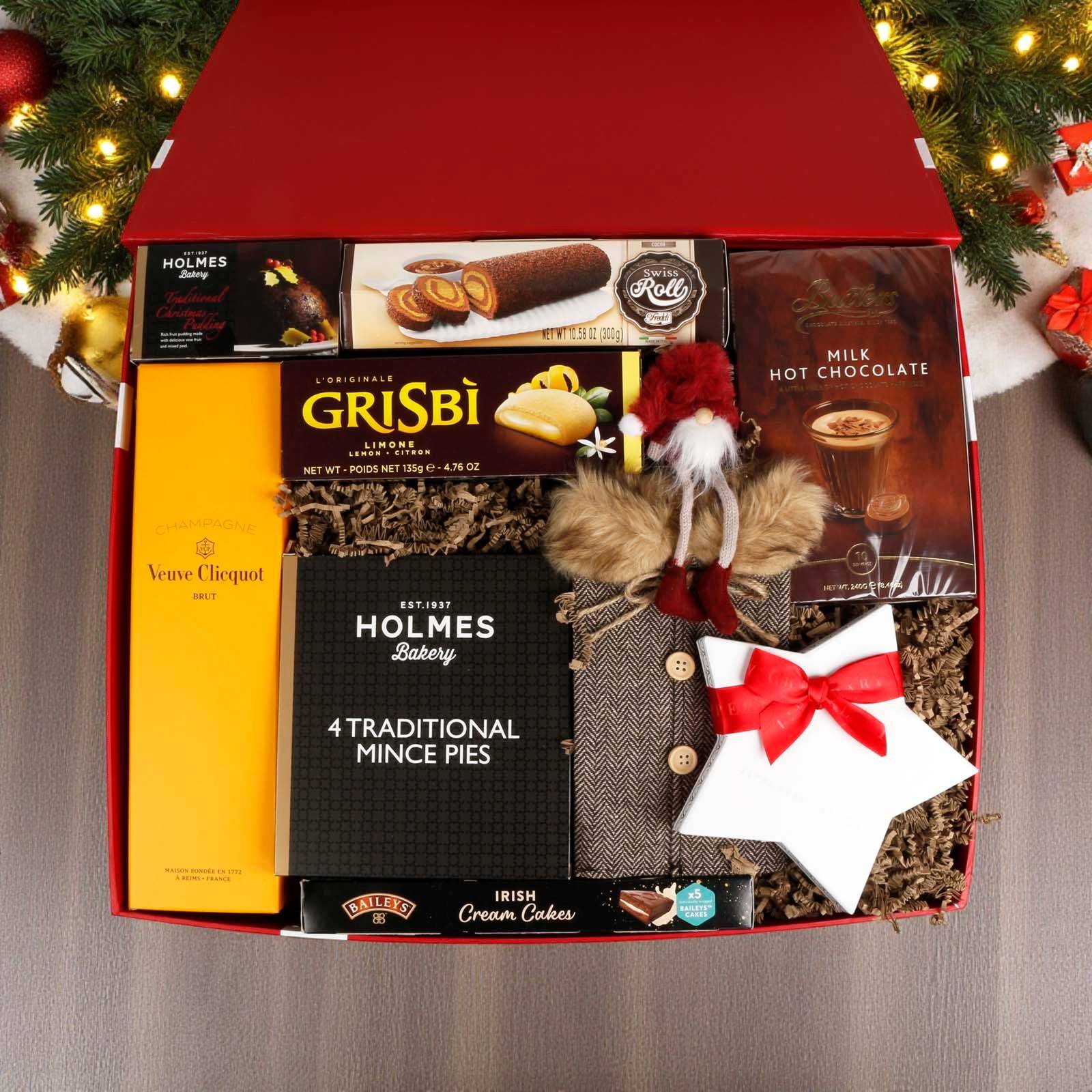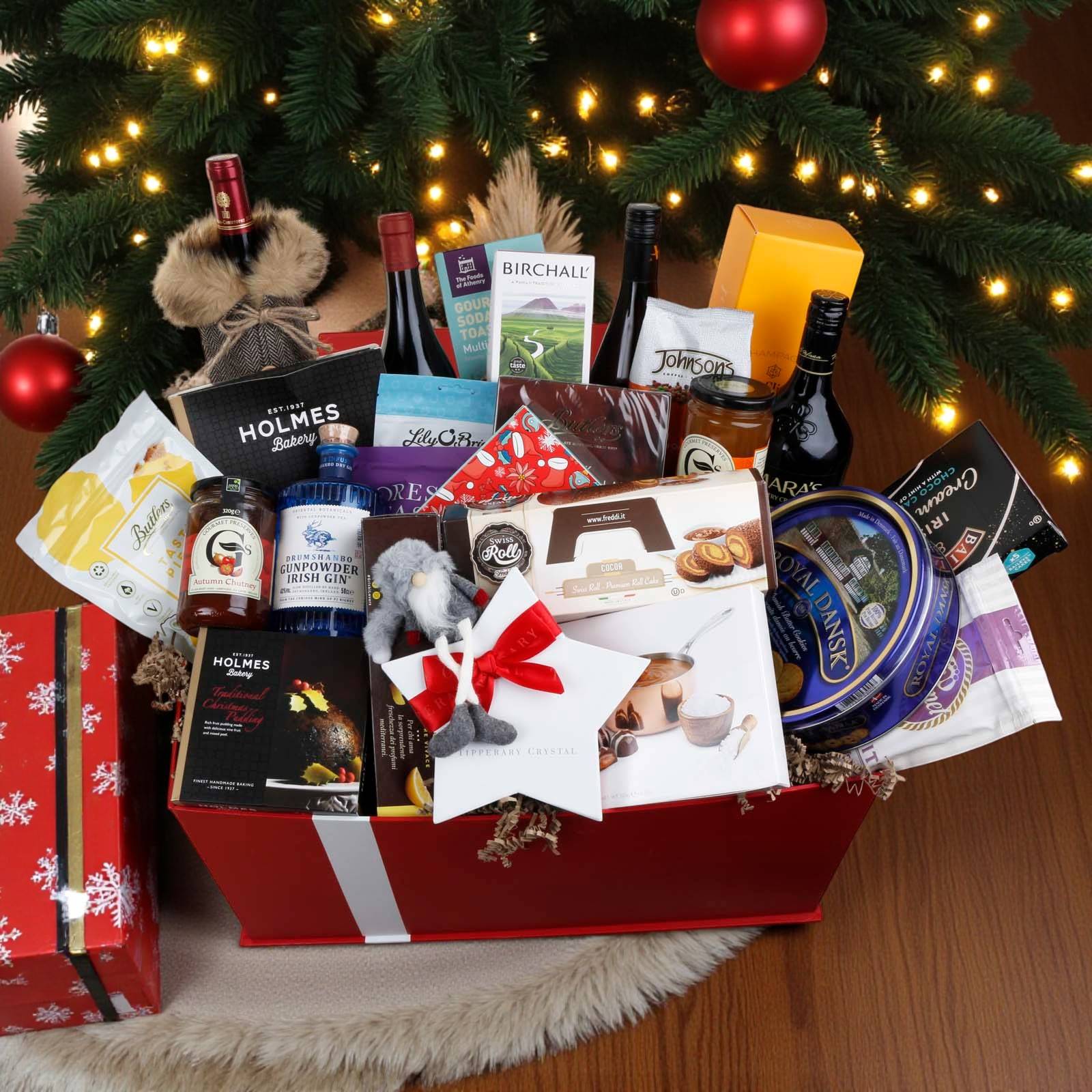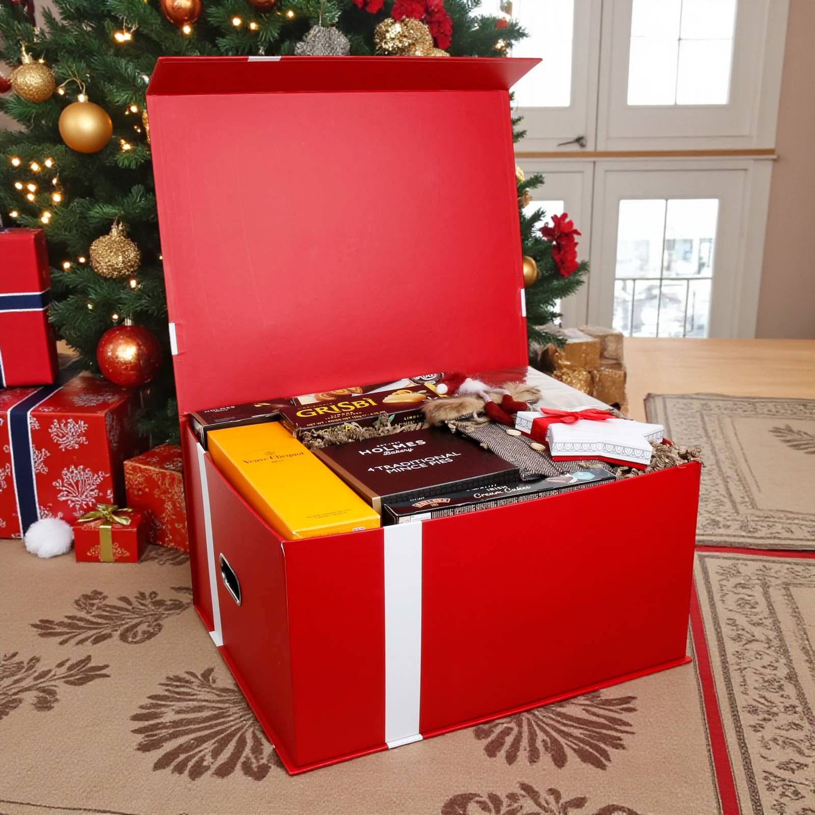 The hamper is presented in a red reusable gift box. The gift box is packed inside a separate shipping box for secure transport.