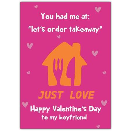 This vibrant Valentine's Day card is perfect for the boyfriend who appreciates a good takeaway as much as a heartfelt sentiment. Featuring a playful design with a bright pink background, cheerful hearts, and a quirky message — "You had me at: 'let’s order takeaway' JUST LOVE" — this card brings humour and warmth to your special day.