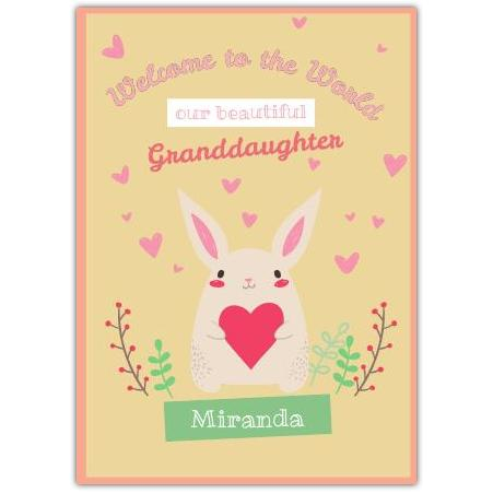 This delightful card features a sweet bunny holding a big red heart, surrounded by adorable pink hearts and gentle greenery on a soft yellow background. The warm message, "Welcome to the World our beautiful Granddaughter," makes it a perfect way to celebrate the arrival of a precious new family member.