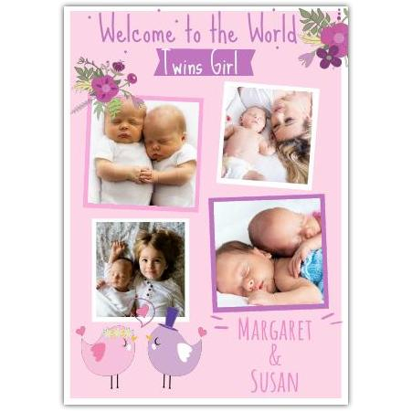 Celebrate the joyous arrival of twin baby girls with this adorable Welcome Twin Girls Four Photo Card. Featuring a charming pink background adorned with delicate flowers and sweet birds, this card beautifully highlights four precious photo spaces to showcase your favourite moments. Perfect for welcoming newborn twins, this personalised card allows you to add heartfelt photos and names, making it a treasured keepsake for proud parents.