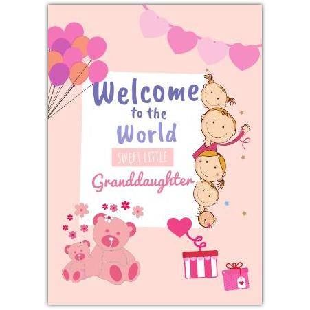 Celebrate the joyous arrival of a precious granddaughter with this charming pink banner greeting card. Featuring delightful illustrations of playful children, cheerful balloons, cuddly teddy bears, and sweet floral accents, this card is the perfect way to say “Welcome to the World, Sweet Little Granddaughter.”