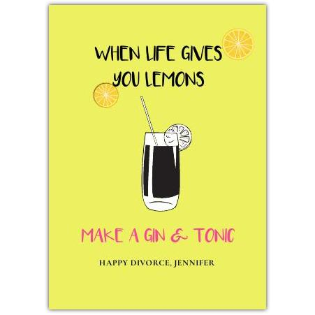 This cheeky greeting card features a bright, lemon-yellow background with playful illustrations of lemon slices and a refreshing gin & tonic. The witty message, "When life gives you lemons, make a gin & tonic," brings a lighthearted spin to life's challenges, making it perfect for those embracing change with a smile.