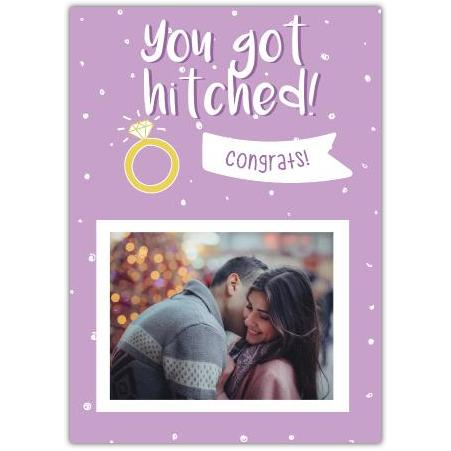 Share your warmest congratulations with this delightful wedding card, designed to capture the joy and excitement of tying the knot. Featuring a playful lavender background adorned with confetti-like dots, the card's cheerful message, "You got hitched! congrats!" is complemented by a stylish illustration of a sparkling engagement ring. This design perfectly conveys the happiness and celebration that come with marriage.