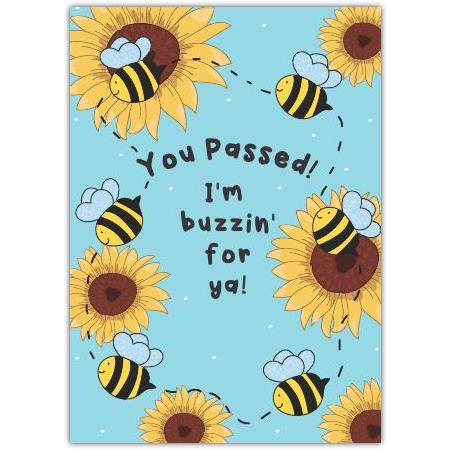 This delightful greeting card features buzzing bees and bright sunflowers to perfectly capture the joy of achievement. With the playful message "You Passed! I'm buzzin' for ya!", it’s an ideal way to congratulate someone on their exams, big test results, or any personal accomplishment.