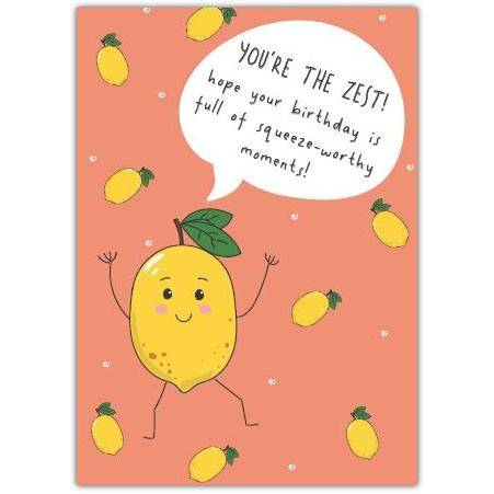 Brighten their birthday with a zesty splash of fun! This cheerful greeting card features an adorable, smiling lemon character surrounded by juicy lemons on a vibrant coral background. With the playful message, "You're the zest! Hope your birthday is full of squeeze-worthy moments!", it’s the perfect way to bring a smile and spread joy on their special day.